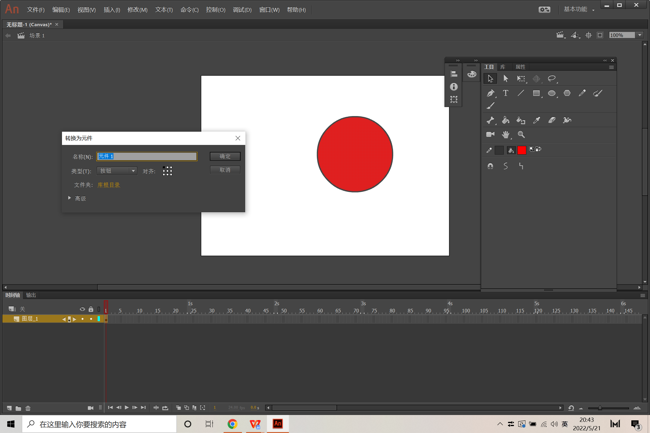 3、能够将绘制矢量图转换为图形元件,并且添加补间动画。
