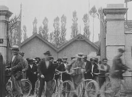 卢米埃尔工厂大门徐徐打开,一群头戴缎带纽结羽帽,身穿紧身上衣和曳地长裙,腰系围裙的女工首先走出,接着是一群手推自行车的男工。