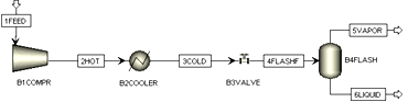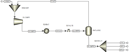 温度为25℃、压力为1.013bar的丙烷,压缩至15bar后冷却到25℃,之后节流膨胀到1.013bar,并分离得到汽态丙烷和液态丙烷,处理量为100kg/h。计算所得液态丙烷产量,并计算压缩和冷却过程的耗能。物性方法采用PR方程,工艺流程可参考图2-1。