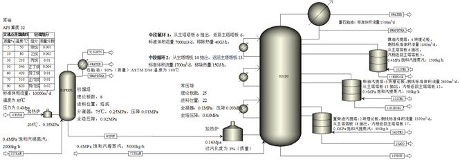重柴油汽提塔:2块理论板,侧线标准体积流量1300m3/d,从主塔塔板18抽出,汽相返回主塔塔板17。