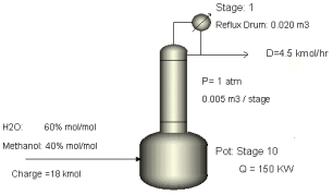 精馏塔采用10块理论板(包括8块塔板以及冷凝器和再沸器)。再沸器为椭圆形封头,直径1m,容积1m3。塔顶采用全凝器,馏出物摩尔流量为45kmol/hr,有回流罐(不需要输入尺寸。因为定义固定压力分布/持液量,因此需要输入回流罐持液量)。塔釜采用夹套加热,热负荷150kW。