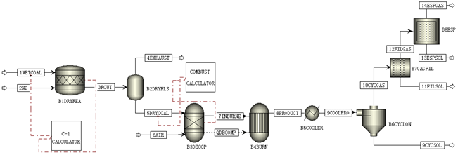 在上节的模拟中,燃烧后的产物通过简捷计算模型SSplit(子物流分离器),将灰分与燃烧气体完全分离。本节中,将把SSplit模型替换为冷凝器、旋风分离器、袋式过滤器和静电除尘器,进行严格气固分离过程的模拟。