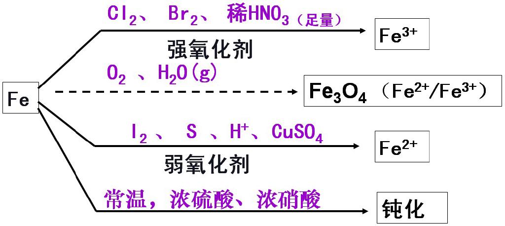 规律:变价金属铁与非金属单质反应时,强氧化剂将铁氧化为高价;较弱氧化剂将铁氧化为低价。注意区分