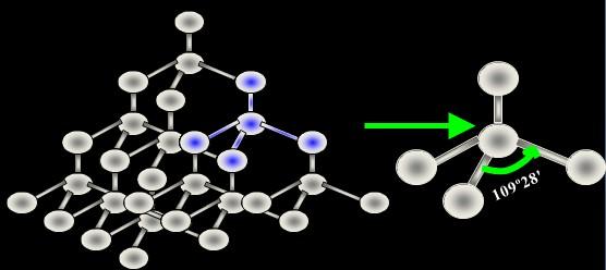 金刚石是一种具有空间网状结构的原子晶体,为正 四面体立体网状结构,金刚石的熔点(>3550℃)和 沸点(4827℃)都很高,硬度很大。