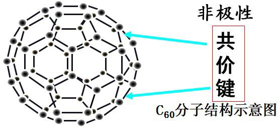 结构:笼状分子,固态时是分子晶体,熔沸点均不及石墨和金刚石,每个碳原子只跟相邻的三个碳原子形成共价键,60个碳原子构成球形,共32面体,包括12个五边形,20个六边形。