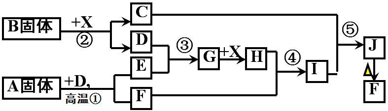 例3、如图,已知反应①、③是工业生产中重要反应,D、E常温下为气体,X常温下为无色液体,H与E相对分子质量关系为 Mr(H)-Mr(E)=34,C焰色反应呈黄色 。