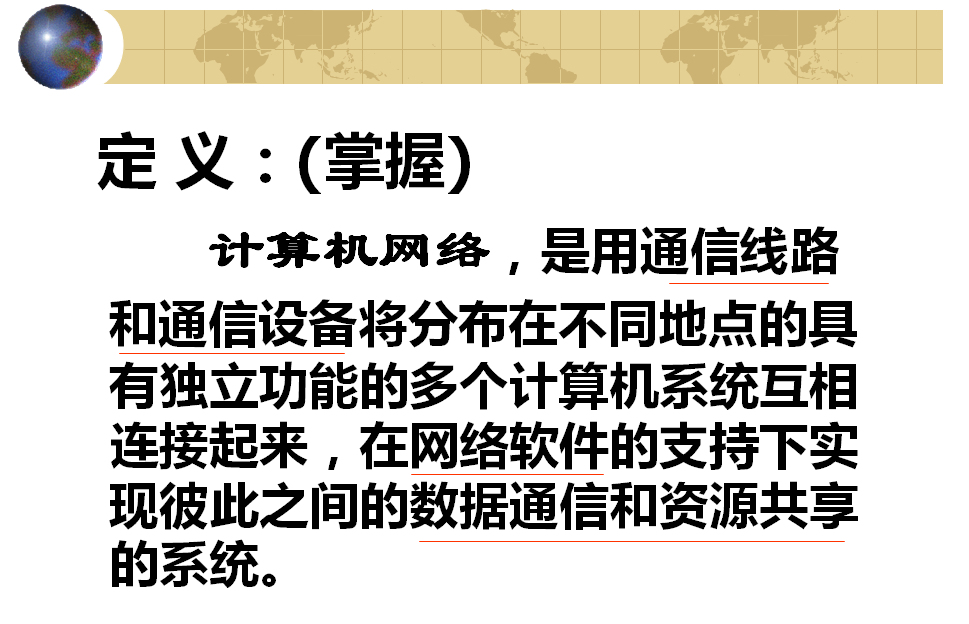 以上两个描述都是关于计算机网络的定义,只不过是介绍的角度有所不同,需要同学们掌握的是前一种描述。各位同学在学习研究的过程中,不要盲从与一种判断,要进行分析判断,全面了解所学的内容。