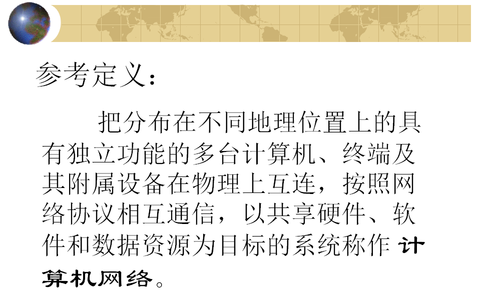 接下来,介绍关于计算机网络的另一种描述,把分布在不同地理位置上的具有独立功能的多台计算机、终端及其附属设备在物理上互连,按照网络协议相互通信,以共享硬件、软件和数据资源为目标的系统称作计算机网络。