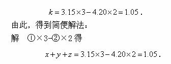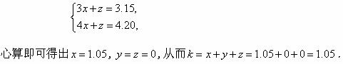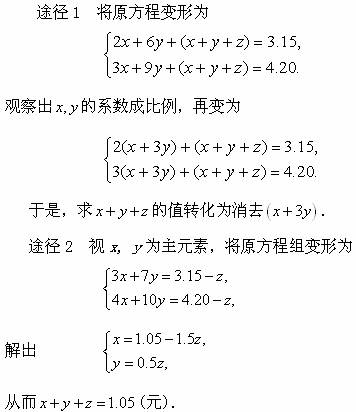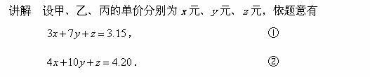 例1有甲、乙、丙三种货物,若购甲3件、乙7件、丙1件,共需3.15元;若购甲4件、乙10件、丙1件,共需4.20元;现在购甲、乙、丙各一件共需几元?