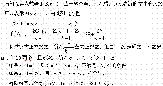 例9、某中学组织学生春游,旅游公司提供了中型客车数辆。最初每辆车乘坐28名人,出发开出一段时间后,发现有一学生迟到没上车.现决定开一辆空车去接他,接回后为赶时间就把这辆空车开走,让所有的人员重新分配,则刚好平均分乘余下的汽车,已知每辆车的载客量不能多于32人,那么原有几辆汽车,这批春游的学生共有多少人?
