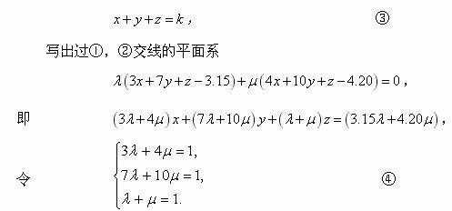 这两个途径都表现出较强的观察、分析和变形能力,但是,如果有空间解析几何知识的话,那就可以居高临下看出,①,②表示了两个平面,而求解则是确定一个过其交线的平面(求