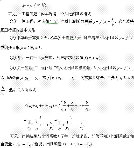 讲解 这是小学时的“工程问题”,几乎没有听说谁做不了的,但解题“不只是为了得个答案”,我们曾从这里提炼出一个解题的“反比例函数模式”.首先,工程问题有基本关系: