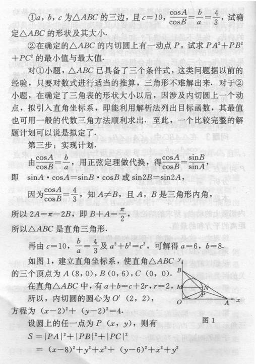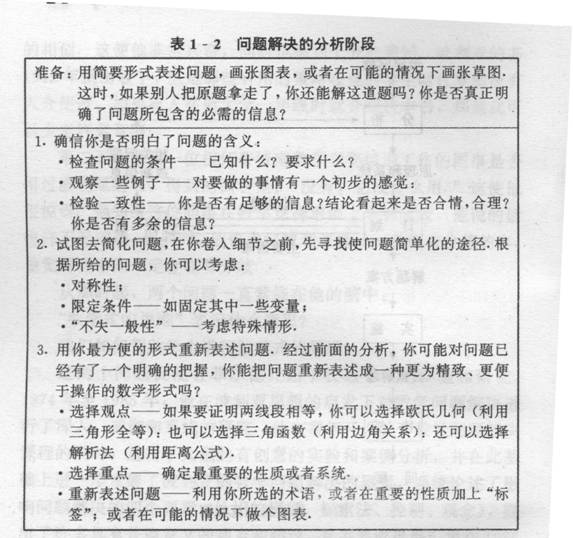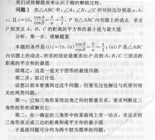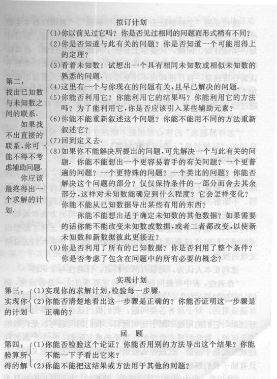 波利亚对数学问题解决的宏观思考过程进行了分析,认为数学解题应分为四个步骤:①理解问题,②拟订计划,③实现计划,④回顾与检验。