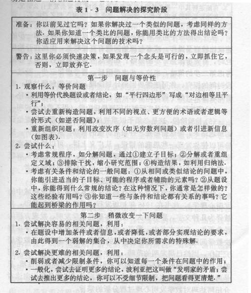 希望提高学生解题能力的教师,必须培养学生的兴趣,然后给他们提供大 量的机会去模仿与实践。如果教师想要在他的学生中发展相应于我们表中的问 题与建议的思维活动,那么他就应该尽可能地经常而自然地向学生提出这些问 题和建议。此外,当教师在全班面前解题时,他应当使其思路更吸引人一些, 并且应当向自己提出那些在帮助学生时所使用的相同问题。由于这样的指导, 学生将终于找到使用表中这些问题与建议的正确方法,并且这样做以后,他将 学到比任何具体数学知识更为重要的东西。