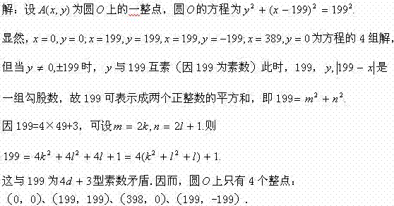 例11、在直角坐标平面上,以(199,0)为圆心,以199为半径的圆周上整点的个数为____________.