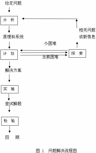 与波利亚的“怎样解题表相比”舍菲尔德进一步分析了问题解决过程中的“控制”情况,将问题解决过程分为分析、计划、探索、实施和检验五个环节。详细的指明了各阶段相应的探索策略,并用流程图的形式描述了问题解决的过程,如图1: