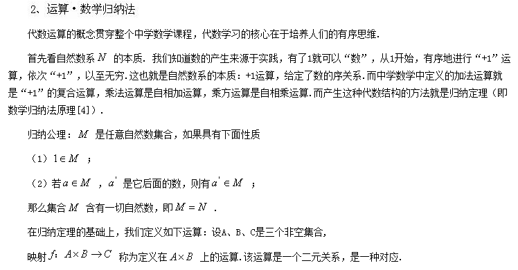 代数学的基本思想就是系统、有效地运用运算律去解决代数问题,而归纳定理则是保证运算律普遍成立的基础,它也是数学证明的有效方法.从小学的算术到中学的代数,二者的区别在于:(1)从形式上看,算术只是在数字之间进行运算,而代数是在不定元与数字之间进行运算;