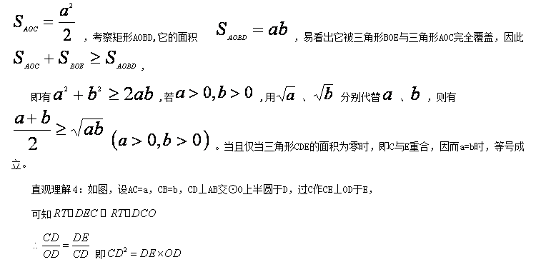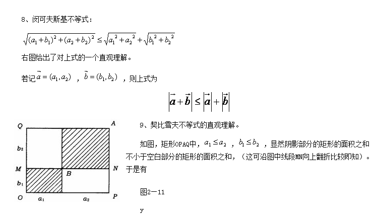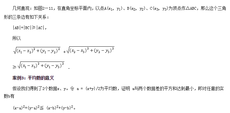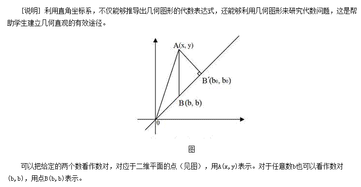 通过以上的一些代数学式的几何表示的例子,我们一定惊叹于数与形结合的美感。可以看出,应用几何的方式来表示代数公式,代数式的意义更直观,理解起来更容易,学生对这些代数式记忆会更容易、更持久。当然以上只是将代数式转化几何表示形式,数形结合当然还包括将几何形式转化为代数形式。而且这种相反的方向也是相当重要的。例如当笛卡尔将坐标系引入代数后,数学家门开始相信所有的几何问题都能转化为代数问题,坐标系的引进,将繁琐或不直观的几何图形问题,转化为简单便于计算的代数问题。因此数学家门掀起了将一切问题转化为代数问题的热潮。笛卡尔的想法是,将所有问题都抽象成数学问题——将所有数学问题转化为代数问题——将所有代数问题转化为方程问题——将方程问题转化为一次方程问题,如此即可将所有问题都转化为代数问题解决。当然不考虑这种做法能否成功,或者是否有意义,这种数与形的转化思想是我们要重视和学习的。著名数学家华罗庚先生说过:“数形结合百般好,割裂分家万事非”,可见数与形是不分家的,数学的教学和学习的过程都不能光侧重某一方面,要让学生经常将数与形结合起来,即学会“以形助数”又要会“以数解形”。