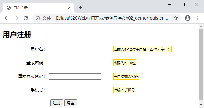 在静态页面上添加各种JavaScript代码及部分CSS样式,通过JavaScript的交互功能对用户输入的注册信息做有效性验证。注册页面,如下图所示。