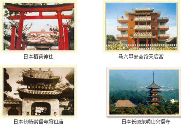 仅仅在日本长崎,1620年前后(对应我国明朝后期)先后建设了三座日本妈祖庙,分别是:1628年,福济寺(即漳州寺);1620年,东明山兴福寺;1629年,圣寿山崇福寺。并称为日本唐三寺。日本其它地方也有妈祖的分庙,图30。