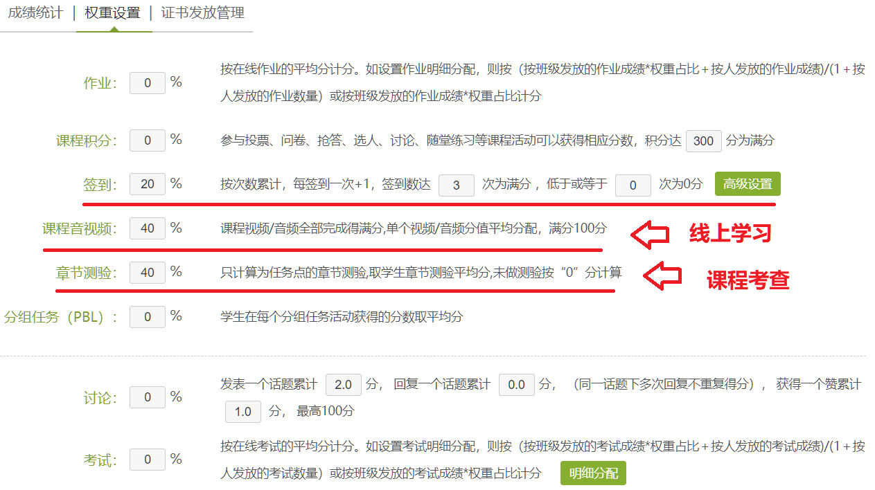 课程总评成绩=出勤签到*20%+线上学习*40%+课程考查*40%