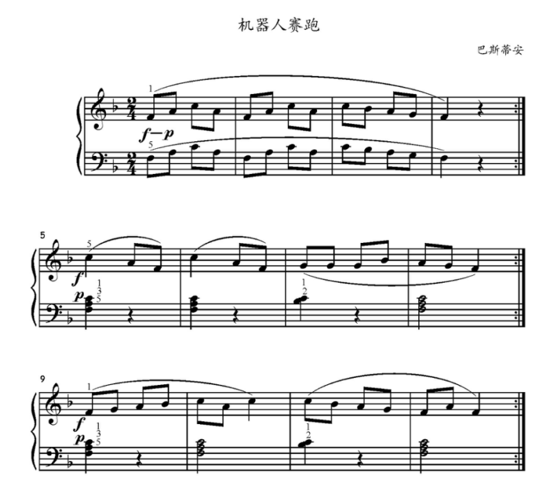 2/4,小快板。由四乐句组成的一段体,五声F宫调式,第13小节的前8后16音符节奏要弹清楚,第3、4小节的指法要弹准确。