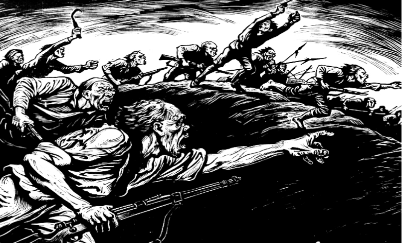 李桦(1907—1995)著名版画家。组画《怒潮》为1946年所创作,包括四张作品,分别为《挣扎》《抓丁》《抗粮》《起来》。作品《起来》是他的《怒潮》组画中的最后一幅,画面运用中西版画表现形式,以动感强烈的刀法刻制出正在为争取民族解放勇敢战斗的群体形象。所塑造的人物极具动感和张力,仿佛要破框而出,紧紧地揪着观者的心绪。