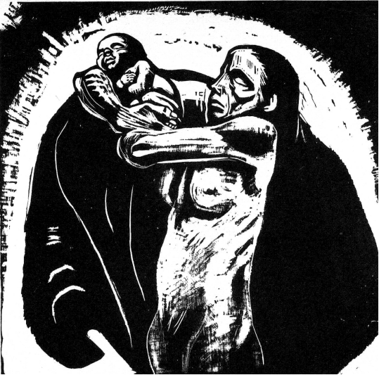 柯勒惠支(1867—1945 )德国版画家。作品《牺牲》是1922 年至 1923 年间创作的大型木刻组画《战争》七幅中之一,这版幅画刻画了一个母亲悲痛地献出她的儿子,去为战争做无谓牺牲的场面。画面气氛凝重、深沉,富于激情,母亲悲痛欲绝的神情是对战争最强烈的控诉和声讨。年幼的儿子紧紧抱着母亲不忍离去,这生死诀别的时刻,包含着无尽的伤痛,是对战争的谴责,也是贫苦人民无法决定自己的命运,只能任人摆布的悲惨境遇的写照。这幅版画,人物形象鲜明,线条粗犷有力,黑白色彩对比鲜明,其中蕴藏着一种特别的艺术感染力。