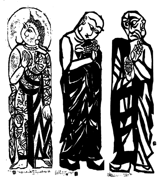 栋方志功(1903—1975)日本现代版画家。作品《释迦牟尼十大弟子》画面刀法粗犷简练,吸取民间剪纸风格,装饰趣味很浓,富于想象力。线条外方内圆,富有弹性。黑白的概括与分布恰到好处,特别是服饰的花纹组成的灰调子在黑色块的压制下显得极其稳重。人物头饰的小块灰调子的处理又与服饰大面积的灰调子进行呼应,最终把视觉焦点引向人物的五官。