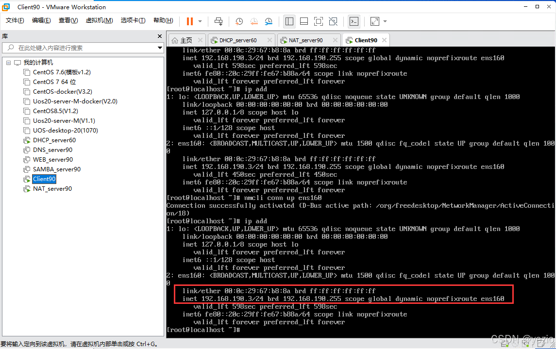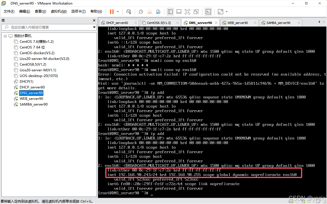 nmcli connection up ens160 #重新加载网卡,使网络配置生效。