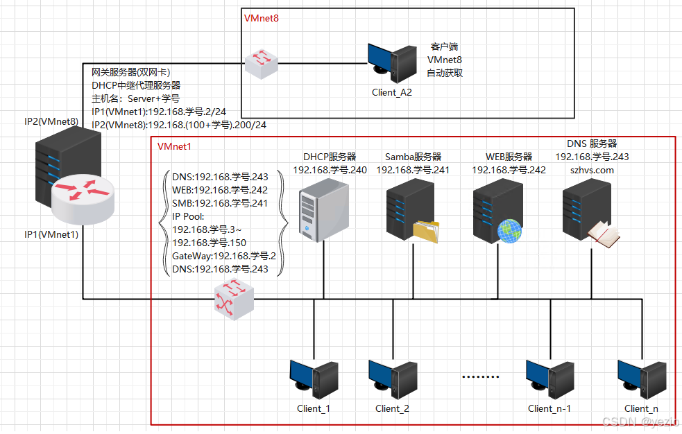 | DHCP服务器 | DHCP_server+学号 | 192.168.学号.240 | 00:0c:29:d9:25:9b |