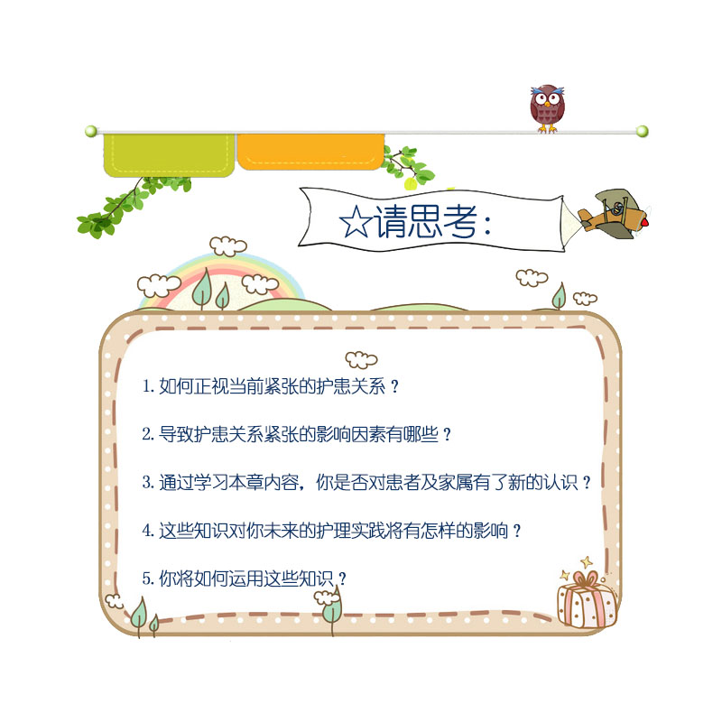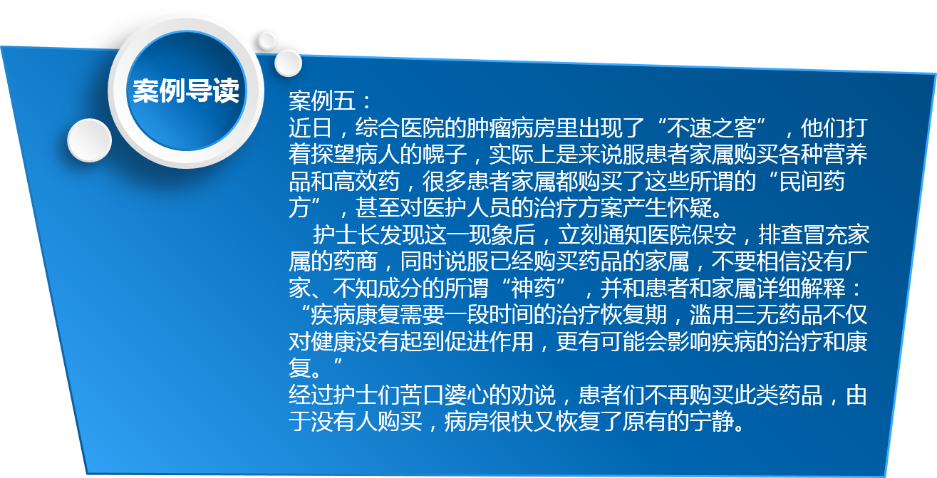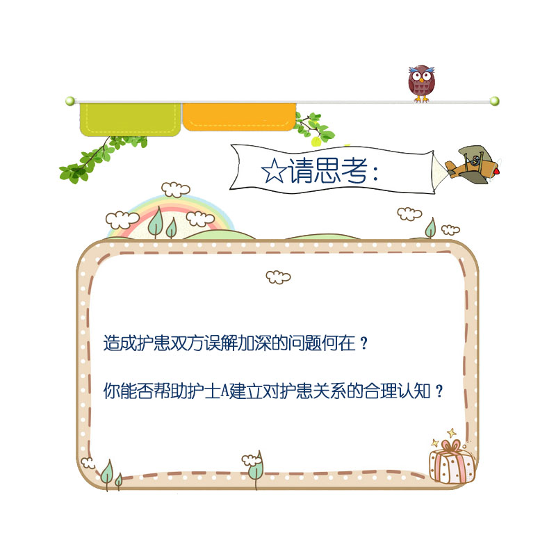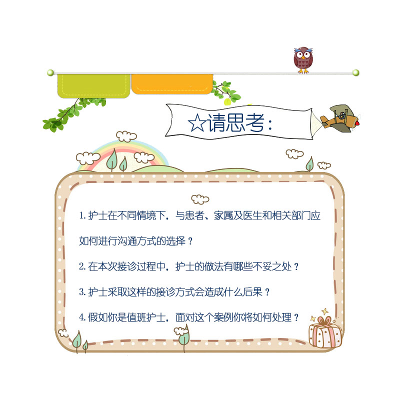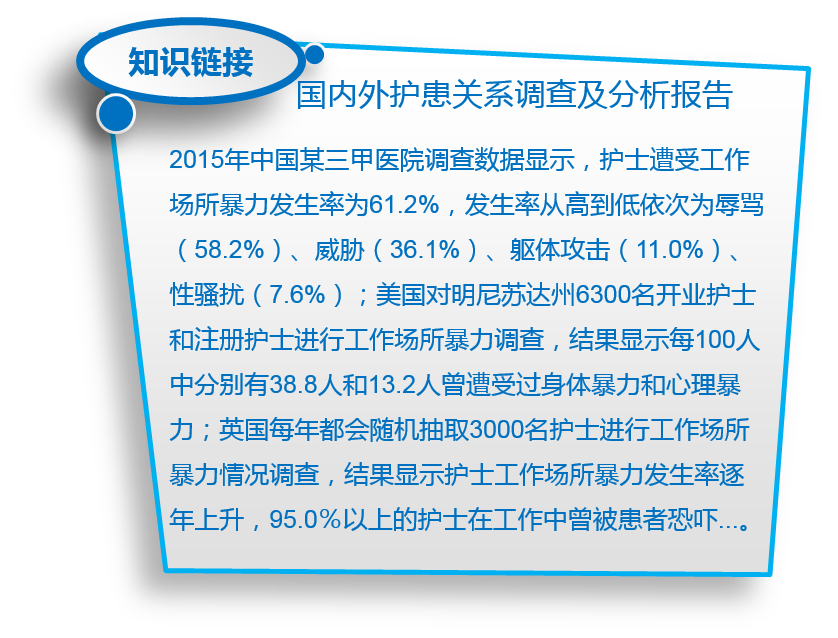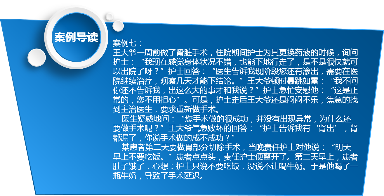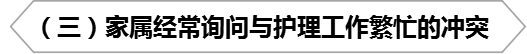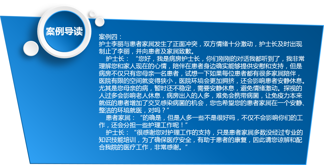 患者家属会时常向护士询问与患者疾病有关的问题,了解患者的病情,这给护士增加了很多重复的工作。正如案例中的护士那样,如果仅强调自己工作忙,或以医院规定作为敷衍,采取冷漠、不理睬或敷衍了事的态度,很可能引起患者家属的误解,甚至出现矛盾冲突。由于患者及家属对医疗知识、医疗护理程序和医院规章制度较陌生,对医院规定或护理工作会产生质疑。如果护士在管理过程中能够耐心沟通、说明缘由,从患者康复的角度出发,与家属达成共识,会避免不必要的纠纷和争执。