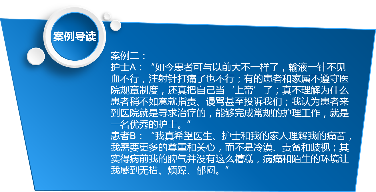 由此可见,案例中护士认为只要解除患者的病痛,帮助其恢复健康,完成技术性关系就是一名优秀的护士,这种认知存在明显的偏差,她忽略了非技术性关系很大程度上能够影响患者对医护人员的评价,影响和谐护患关系的建立。临床护理工作中,技术性关系和非技术性关系之间是相互依赖、相互作用和相互影响的。当护患双方关注点不同时,就容易导致护患关系紧张,甚至引起护患纠纷。