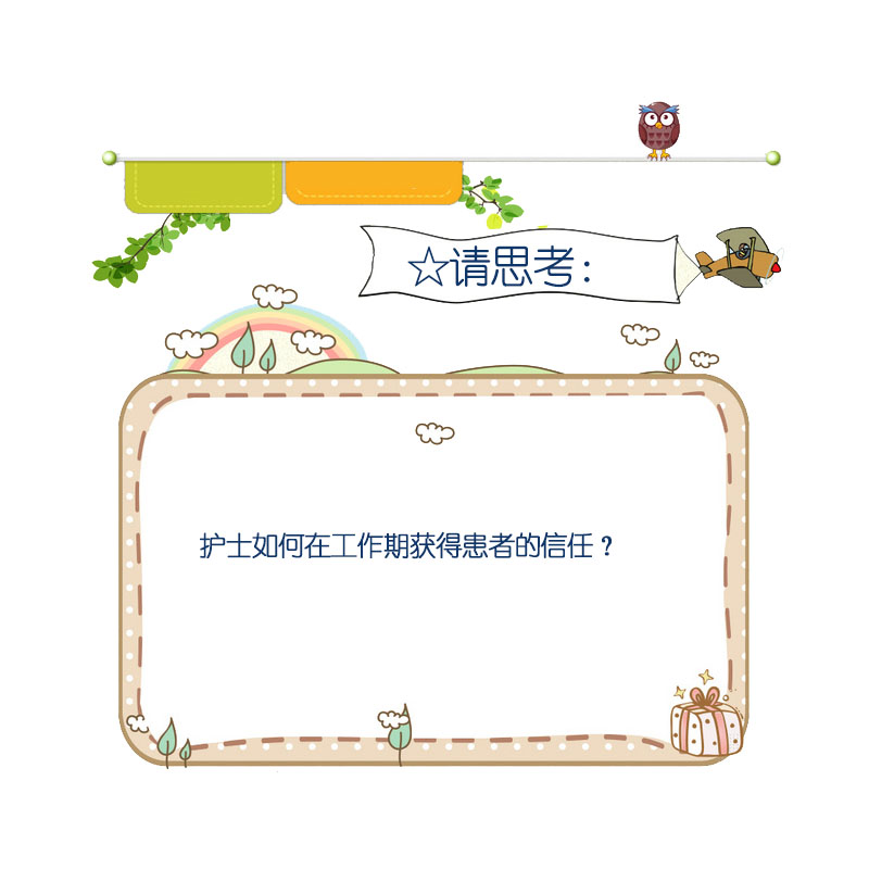 因此,护士应以高尚的医德、精湛的技术、热情的态度和耐心的服务,真诚的关心、帮助和尊重患者,尽量满足他们的合理需求,获得患者的信任。