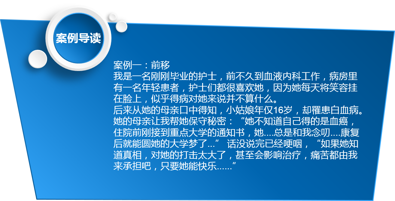 疾病不仅给患者带来痛苦,同时也会引起患者家属痛苦心理的连锁反应,尤其是对于突发事件导致的危重患者或绝症患者的家属。按照我国医疗保护惯例,对于心理承受能力较差的患者,医护人员一般采用“超越式”沟通方式,首先将患者的病情和预后告诉患者家属。案例一中护士将患者的病情提前告知了患者的母亲,此时患者家属常常要比患者本人更早承受精神上的打击,并且还要将这种打击藏在心里,不在患者面前表露。护士应认识到患者家属是患者病痛的共同承受者,有时与患者家属开展良好的沟通,会使沟通成效更加显著。
