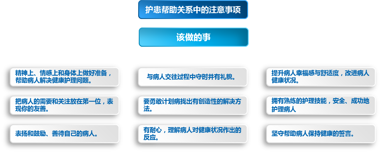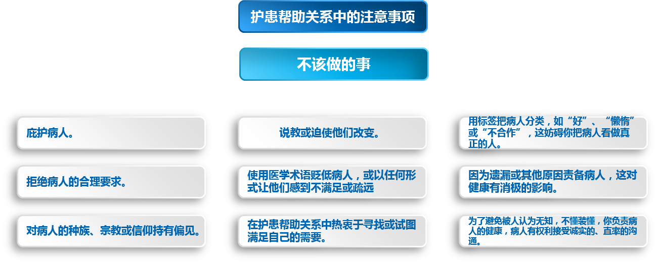 护患之间的帮助关系是护士将病人的利益放在首位,帮助病人达到保持最佳的健康状态。护患关系的特点之一,是将护患关系建立在相互信任和负责任的基础之上,与病人、家属和其他护理人员建立合作关系。护理工作进程中,护士要尊重病人及家属的期望与偏好,根据不同病人的情况满足其需要,包括耐心地为病人提供所需要的健康知识,帮助病人做出自我护理、康复、疾病预防及善终的决定。