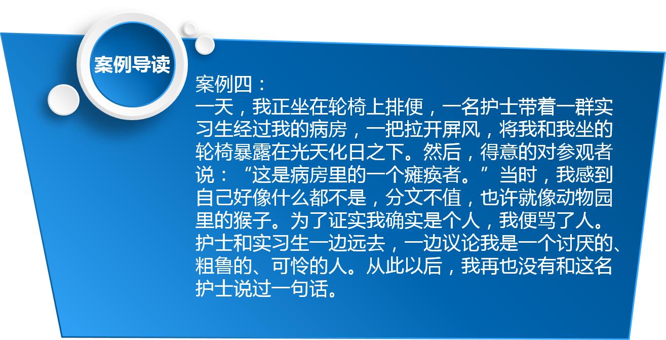 是非技术性关系中最重要的内容。由于护患双方地位、生活环境、文化层次、道德修养等不同,在护理工作中常会对一些问题或行为在理解和要求上产生不同看法,道德规范则成为约束护患双方行为的有力依据。正如案例中患者对护士期望的那样,尽量站在患者的角度考虑,理解并尊重患者的行为方式。此外,护士应遵守职业道德规范,这对维护患者的权益,改善护患关系有着积极的作用。
