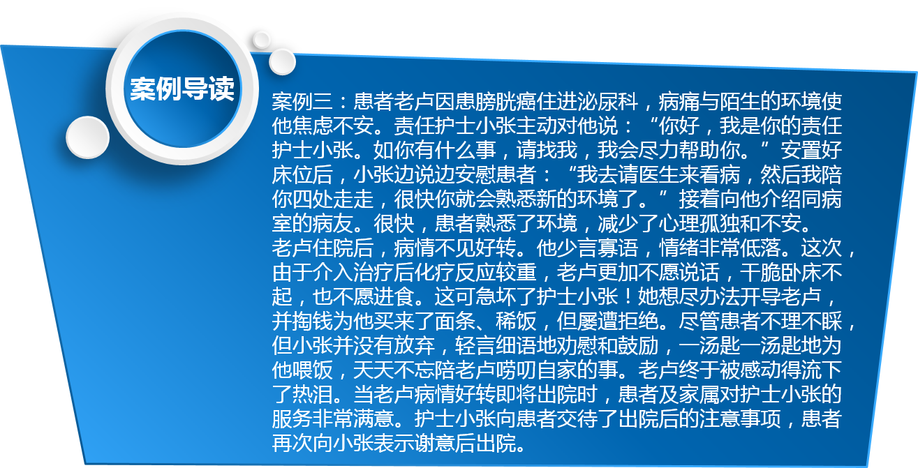 案例中的老卢从入院至出院,经历了护患关系的发展三阶段,患者多次的情绪变化,护士耐心的应对与解决,不但有助于患者及疾病康复,而且获得了患者的充分信任,建立了良好的护患关系。