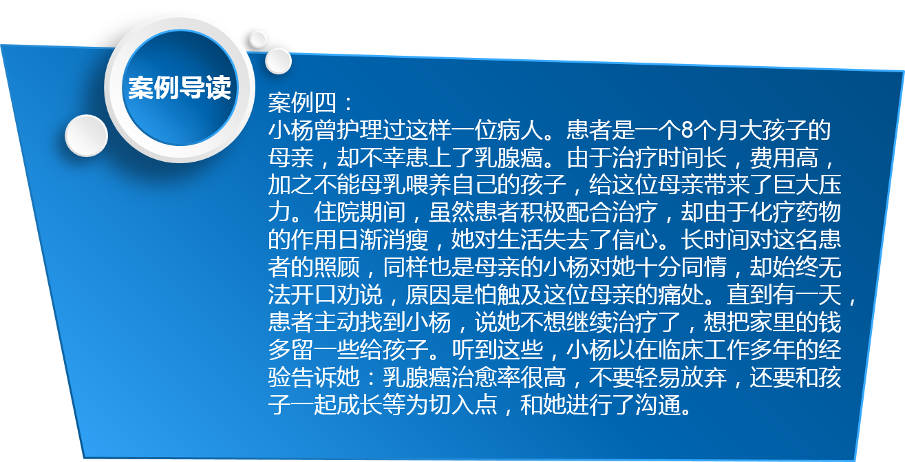 安慰性语言是一种使人心情安适的语言表达方式。护士在患者有病时使用安慰性语言,其力量比任何时候都显得生动、有力,如果给病人举一些实例,就更容易在护患、患者与患者之间产生共鸣,进而稳定患者的情绪,帮助患者克服暂时性的困难,树立战胜疾病的信心,有利于患者的康复与治疗。