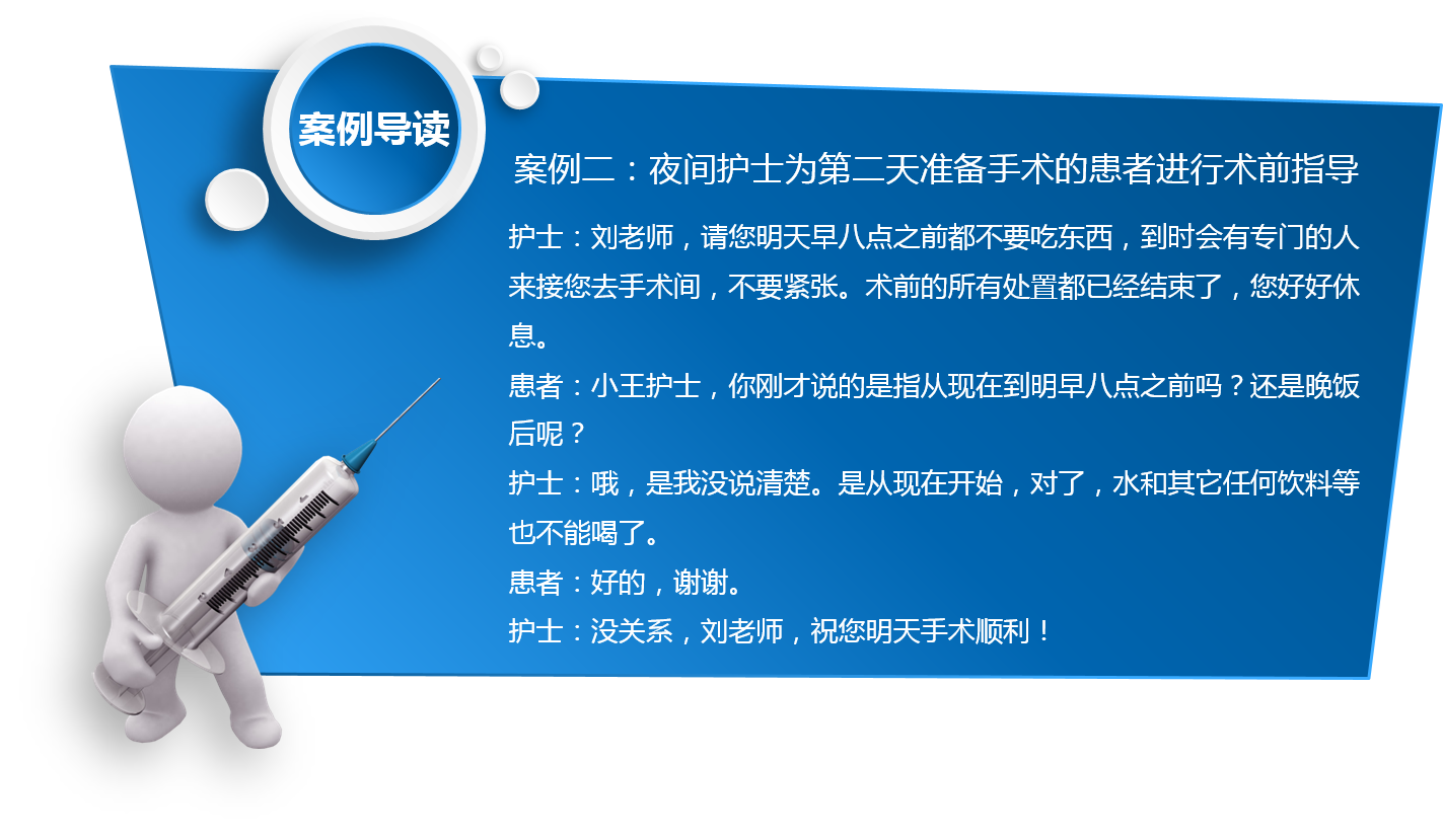 所谓直接性是指口头沟通的信息传递量大、速度快、最为直接。通过案例二,护士指导患者术前注意事项的内容不清晰、不具体,导致患者又再次询问确定。口头沟通在短时间内信息的传送双方要迅速反馈,及时检查并修正,以达到对信息准确无误的接收。