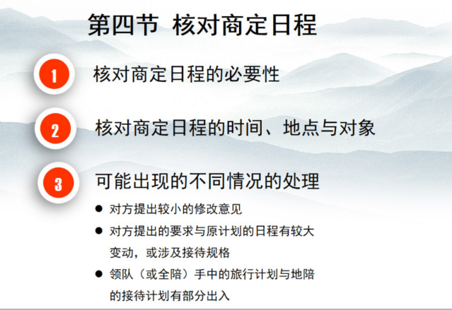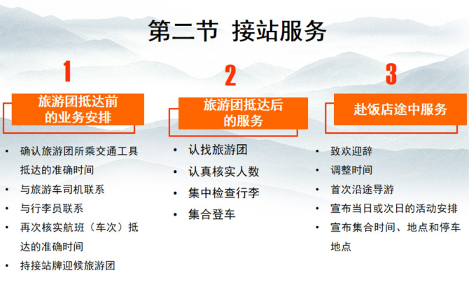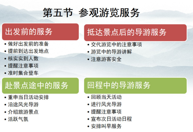 地陪商定日程、参观游览服务、送站服务、善后服务的操作规范。