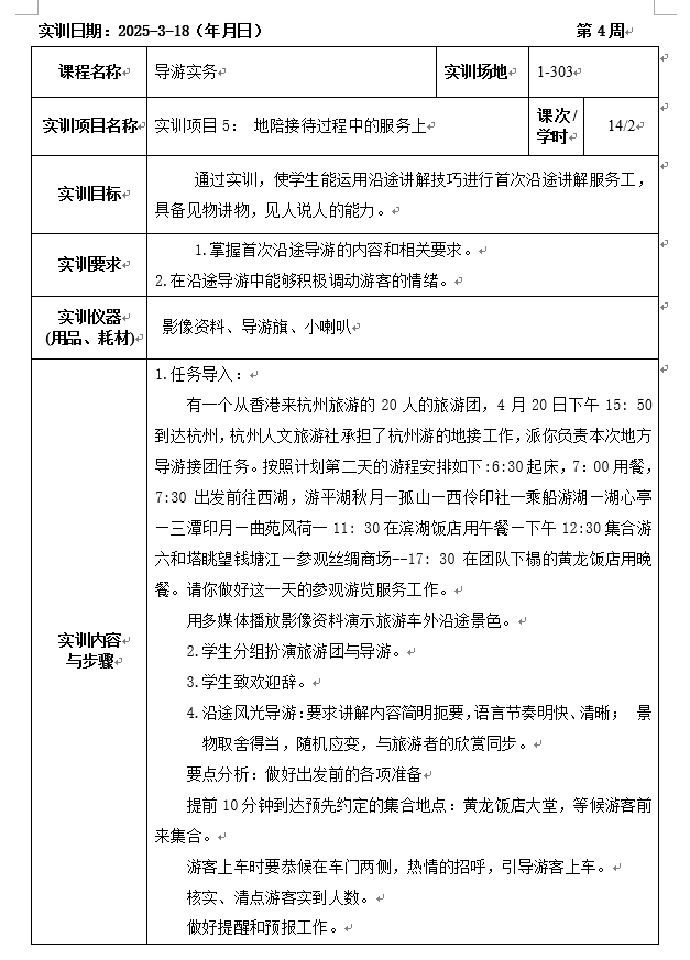 项目五:参观游览服务 | 【导入任务】 有一个从香港来杭州旅游的20人的旅游团,4月20日下午15: 50到达杭州,杭州人文旅游社承担了杭州游的地接工作,派你负责本次地方导游接团任务。按照计划第二天的游程安排如下:6:30起床,7:00用餐,7:30出发前往西湖,游平湖秋月—孤山—西伶印社一乘船游湖—湖心亭—三潭印月—曲苑风荷一11: 30在滨湖饭店用午餐—下午12:30集合游六和塔眺望钱塘江—参观丝绸商场--17: 30在团队下榻的黄龙饭店用晚餐。请你做好这一天的参观游览服务工作。 【分配任务】 请学生分组讨论完成上述任务。 【教师讲解】 教师点评并总结相关知识点。并辅以视频教学。 【板书设计】 项目五:参观游览服务 步骤一:做好出发前的各项准备 步骤二:途中导游服务 步骤三:景点导游服务 步骤四:返程服务 【情景模拟】 景点介绍三潭印月。 【师生互动】 如何做好参观游览环节导游服务工作? | |