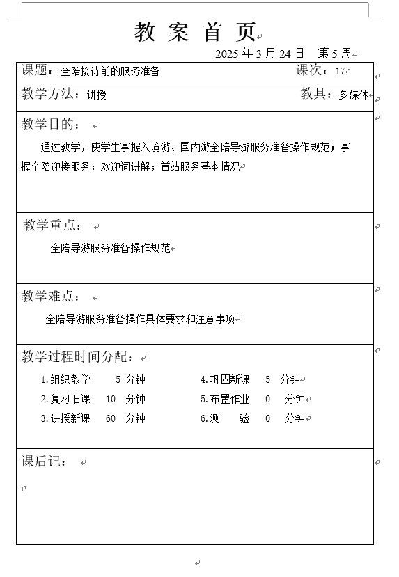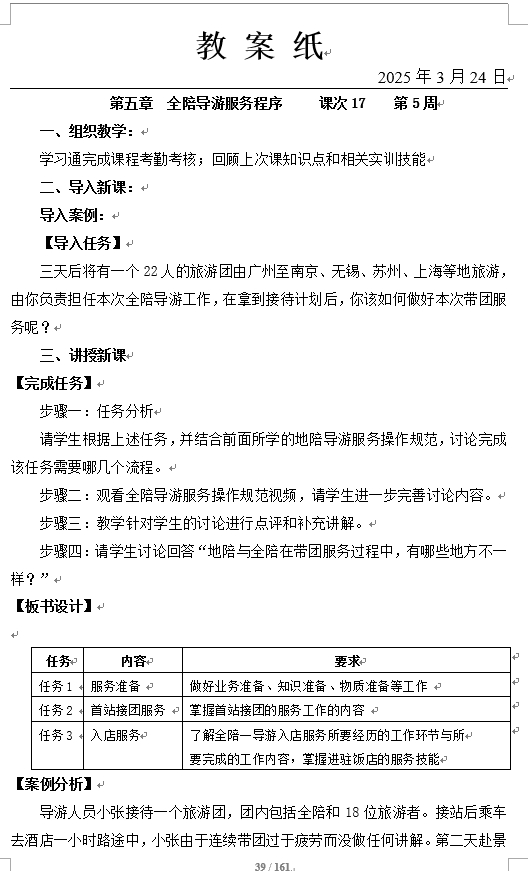 新课讲授 | 【完成任务】 步骤一:任务分析 请学生根据上述任务,并结合前面所学的地陪导游服务操作规范,讨论完成该任务需要哪几个流程。 步骤二:观看全陪导游服务操作规范视频,请学生进一步完善讨论内容。 步骤三:教学针对学生的讨论进行点评和补充讲解。 步骤四:请学生讨论回答“地陪与全陪在带团服务过程中,有哪些地方不一样?” 【板书设计】 任务 | 内容 | 要求 | 任务1 | 服务准备 | 做好业务准备、知识准备、物质准备等工作 | 任务2 | 首站接团服务 | 掌握首站接团的服务工作的内容 | 任务3 | 入店服务 | 了解全陪一导游入店服务所要经历的工作环节与所 要完成的工作内容,掌握进驻饭店的服务技能 | 任务4 | 核对商定日程 | 掌握全陪如何与地陪核对、商定旅游活动日程 | 任务5 | 各站服务 | 掌握全陪与各站地陪之间如何做好衔接 | 任务6 | 离站服务 | 掌握全陪在离站时应做的服务工作 | 任务7 | 途中服务 | 掌握途中服务的内容与服务能力 | 任务8 | 末站服务 | 掌握全陪在末站服务中的工作及相关要求 | 任务9 | 善后工作 | 掌握全陪后续工作的正确处理 |