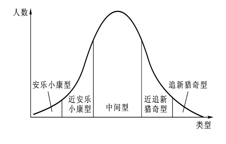 5、美国的斯坦利·帕洛格(StanleyPlog)博士用“安乐小康型”及“追新猎奇型”来表示美国人的个性类型 。
