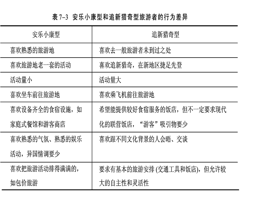 安乐小康型的人强烈要求生活具有可预见性,他们的行为倾向是消极、被动的,以休息和松弛为主要旅游动机。他们理想中的度假旅游应该是有条不紊、事先都安排好的,包括旅游的全部活动、旅游设施、餐馆以及提供接待等方面。
