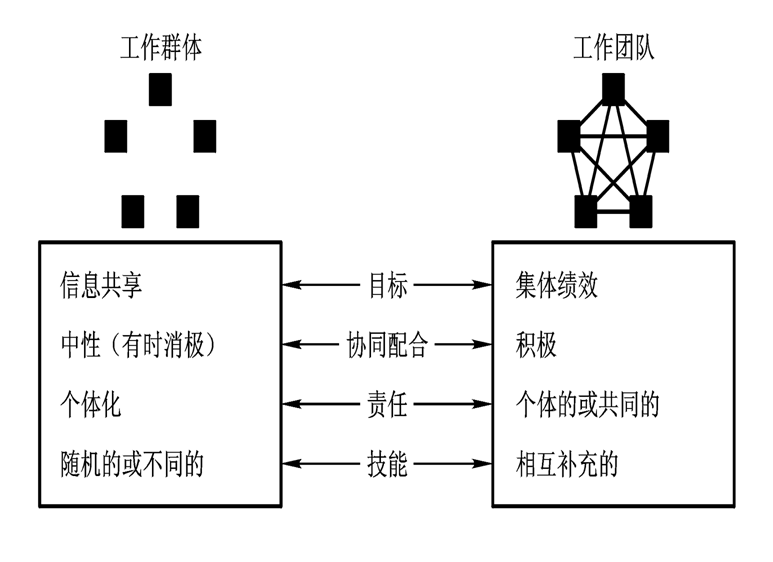 在工作群体中,成员通过相互作用,来共享信息,作出决策,帮助每个成员更好地承担起自己的责任。在工作群体中,不存在一种积极的协同作用,能够使群体的总体绩效水平大于个人绩效之和。图14-5明确展示了工作群体与工作团队的区别。