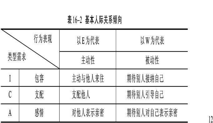 舒兹不仅区分了人际关系需求的三种类型,而且又进一步将人们的行为分为两种:(1)积极的表现者(以E为代表);(2)被动的期待他人的行动者(以W为代表),从中分出六种基本的人际关系的倾向,如表16-2所示: