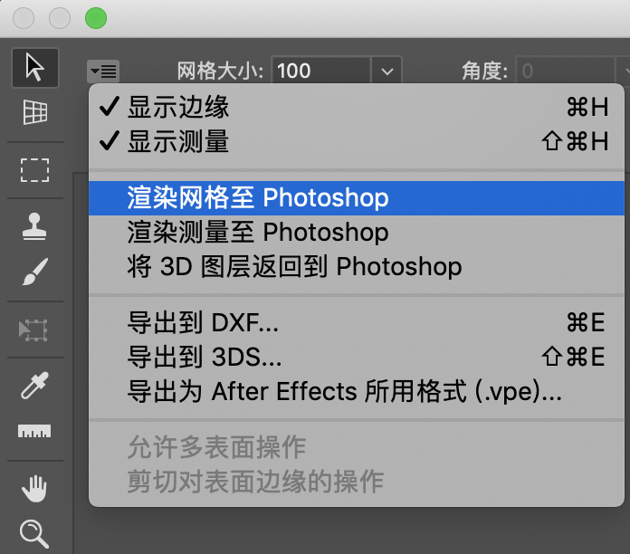 步骤5 选择工具栏右侧的“消失点设置和命令”(一个小三角形+三条杠的图标),选择“渲染网格至photoshop”。注:不同版本的PS,翻译名称可能不一样。