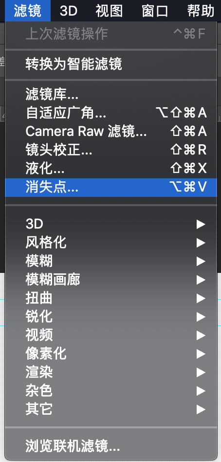 步骤2 选择该图层,菜单“滤镜-消失点”。