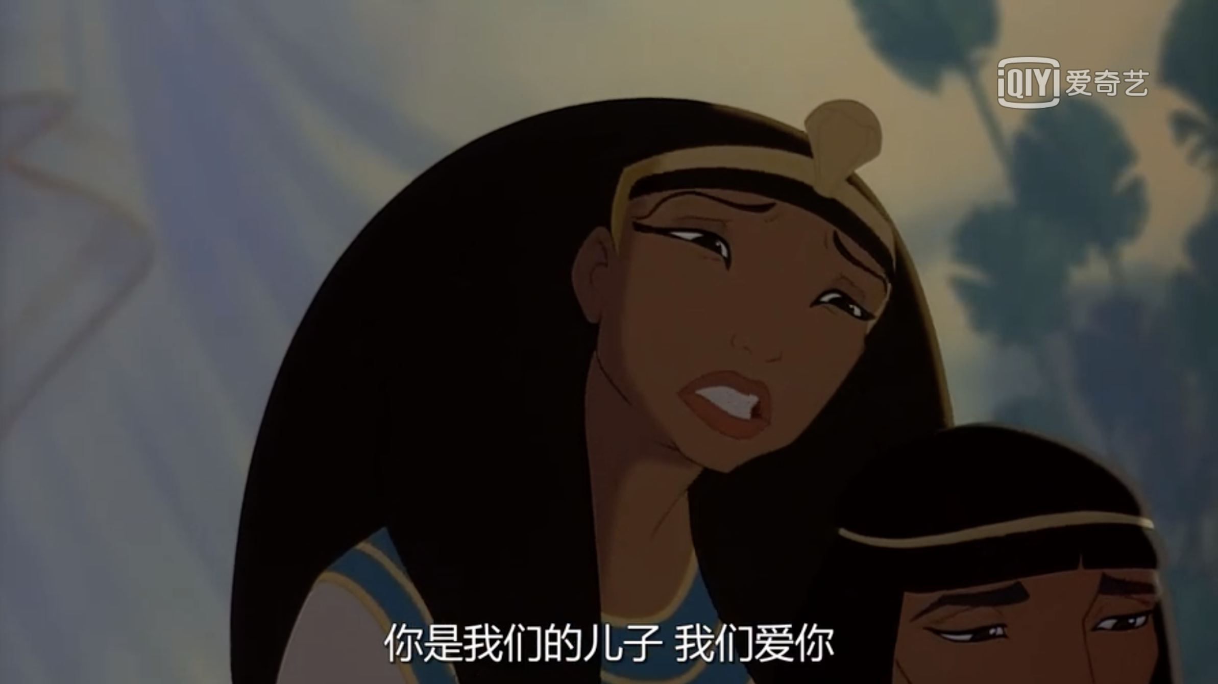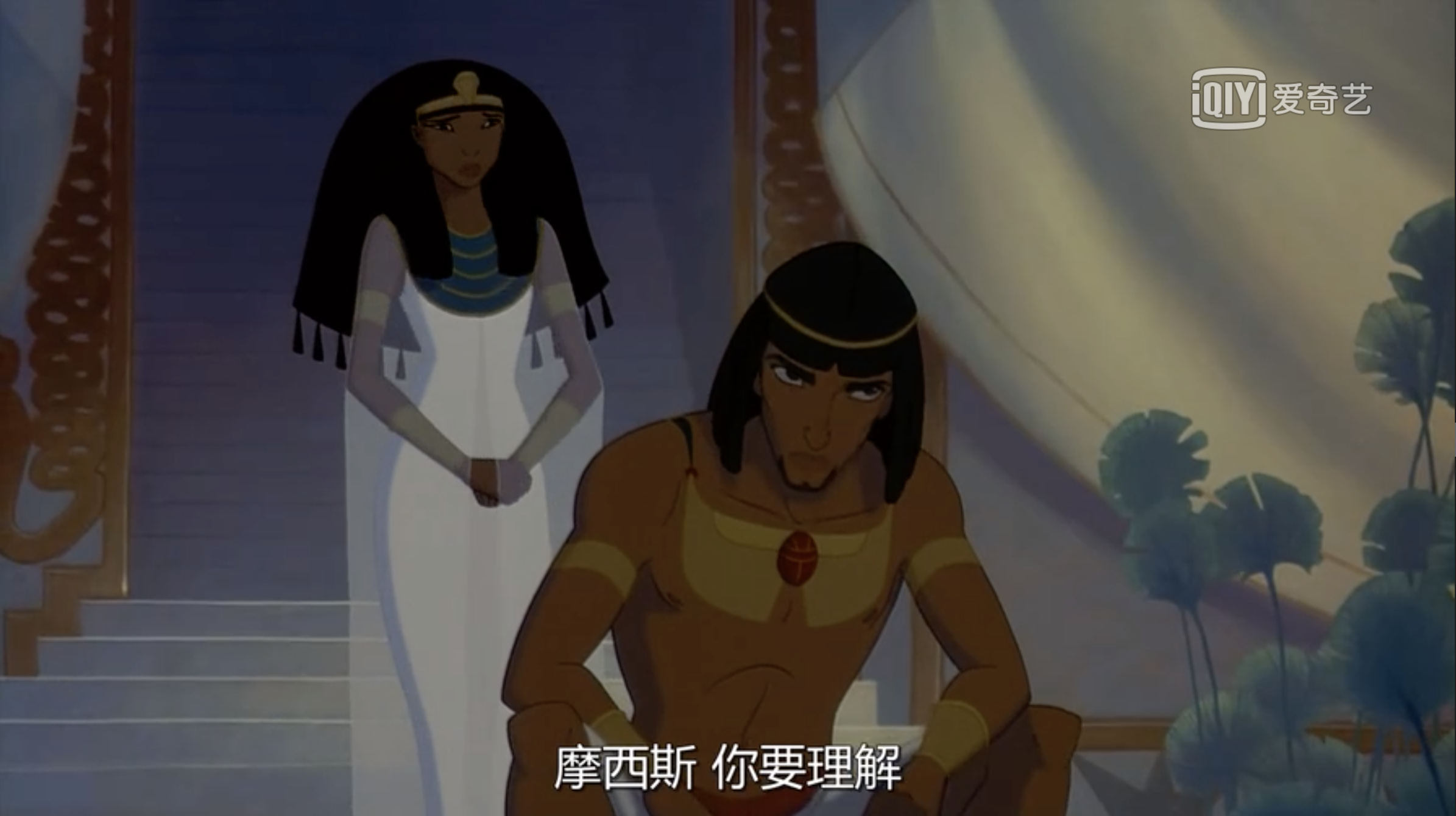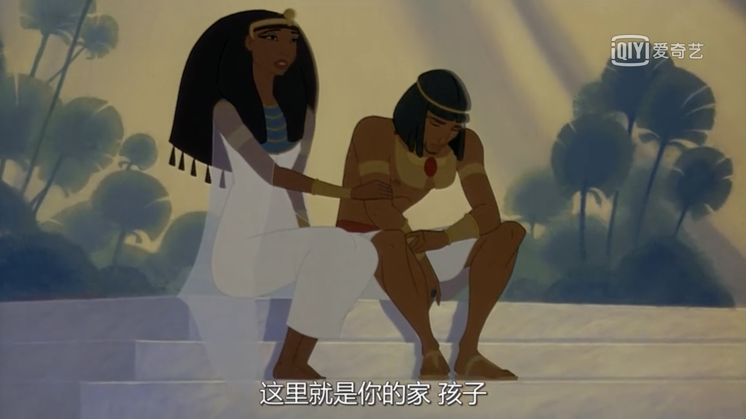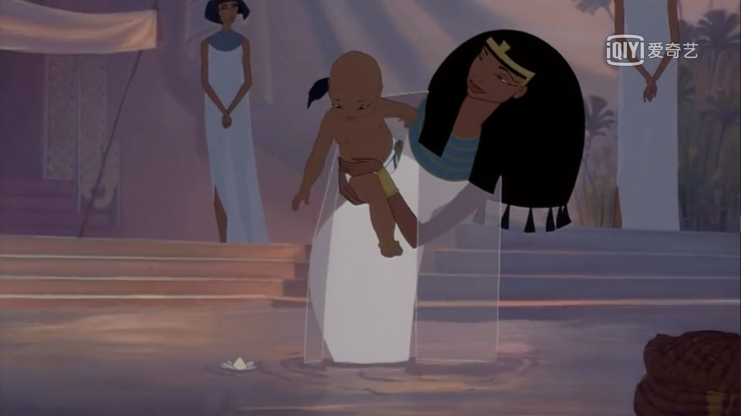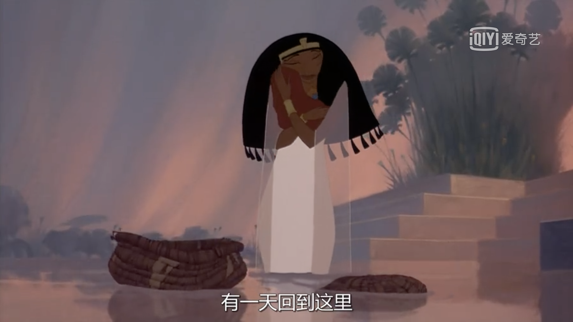 皇后一开始出现,以及摩西知道真相后去寻求母后帮助的场景,都是这个莲花池。用这种充满生机的池塘、植物,柔和的色调,和老法老出现的场景,以及奴隶被奴役的场景形成对比。塑造了母后和蔼、柔美的形象。